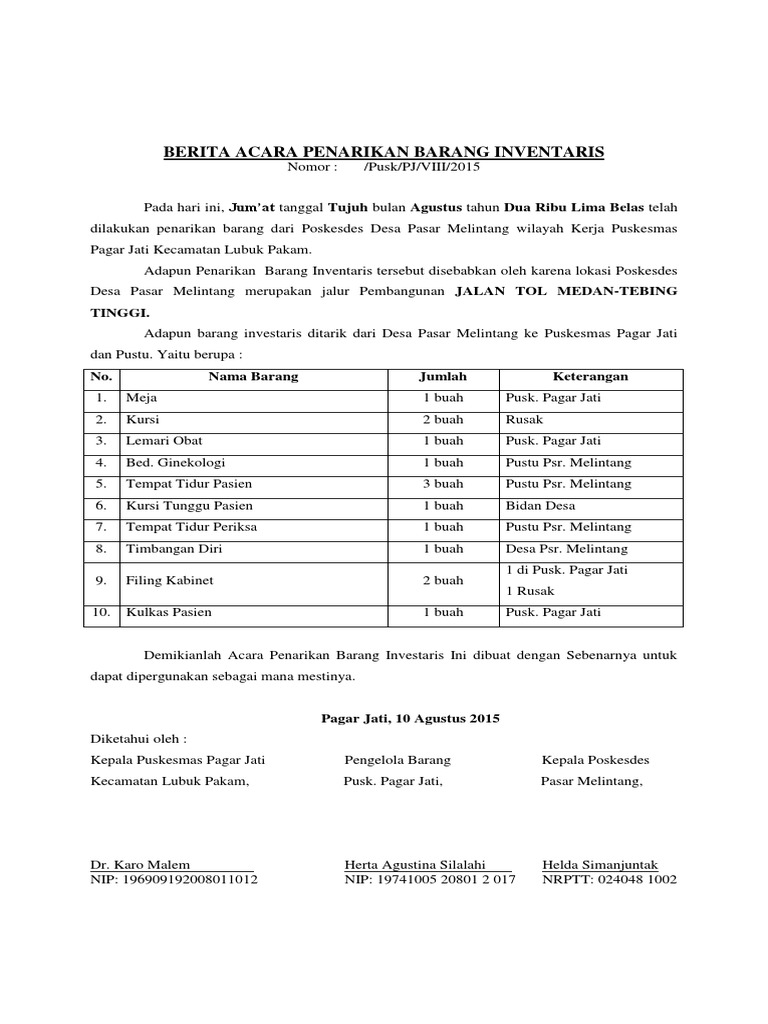 Recommended Contoh berita acara pho proses ba pemeriksaan pek. Demikian Berita Acara Penyerahan Barang Jaminan ini saya buat dengan sebenarnya dalam keadaan sadar tanpa ada pengaruh tekanan atau paksaan dari pihak manapun dan berani diangkat sumpah apabila diperlukan. Sri MulyaniSP Mewakili Pihak sekolah. Berita acara pinjam pakai barang milik negara bmn diunggah oleh. Contor Surat Pengantar Pengambilan Barang. Contoh Surat Perjanjian Kredit Fh Uii.